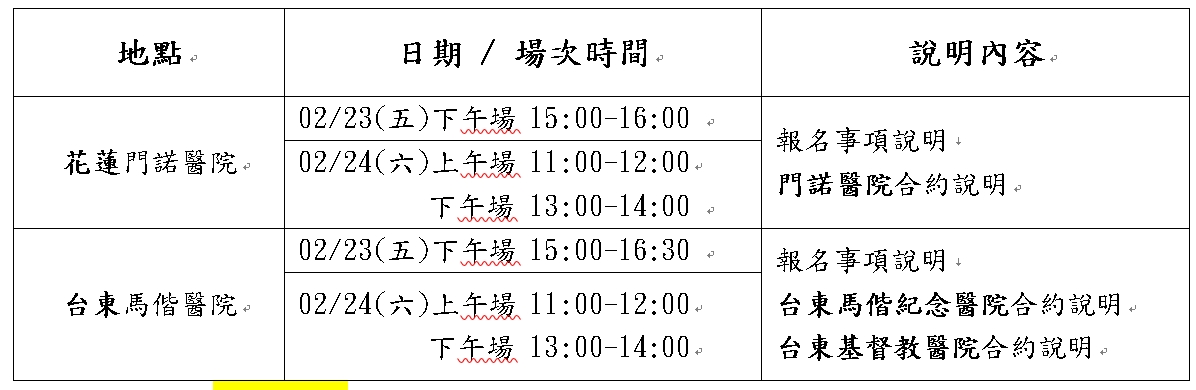 活動地點: (1)臺灣基督教門諾會醫療財團法人門諾醫院(民權路44號) 平安樓8樓 會議室 (2)馬偕醫療財團法人台東馬偕紀念醫院(長沙街303巷1號) 恩典樓9樓 李庥紀念禮拜堂
