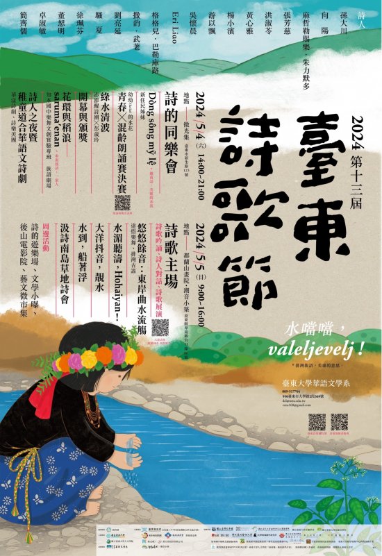 - 臺東詩歌節今年以「水噹噹,valeljevelj!」為題,從臺東╱臺灣出發,連結世界南島民族文學家,在族群多元、文化多彩、語言繽紛、風土靚秀、人情真媠的「臺東」,以詩歌的對談、展演與再製等多重表現形式,詮釋與流佈南島人文風華。