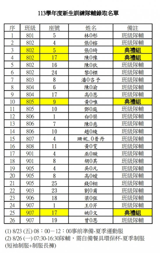 協助113學年度新生訓練的八九年級隊輔同學,請留意到校時間