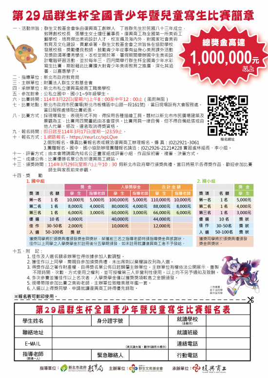 新北市私立復興高級商工職業學校承辦財團法人群生文教基金會「第29屆群生杯全國青少年暨兒童寫生比賽」簡章