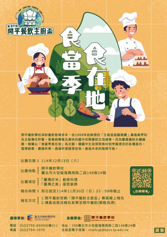 一、 開平餐飲學校長年致力於推展餐飲專業教育,讓餐飲文化能向下紮根。自西元1999年起,由開平餐飲師生共同舉辦的「主廚盃餐飲競賽」,邀請業界主廚擔任評審,並公開講評指導,成為國中生難得可獲名廚親授經驗的校際交流賽事。本次主題是「食當季食在地」,希望透過此次活動,讓孩子們發揮創意實踐所學,透過料理展現自我,創造未來的無限可能。