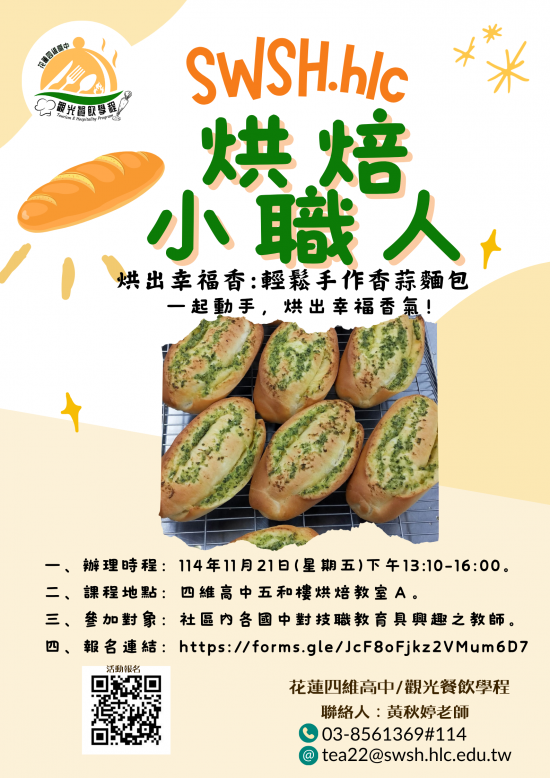 (二) 研習地點:花蓮縣四維高級中學五和樓烘焙教室A。(花蓮市中山路一段200號)