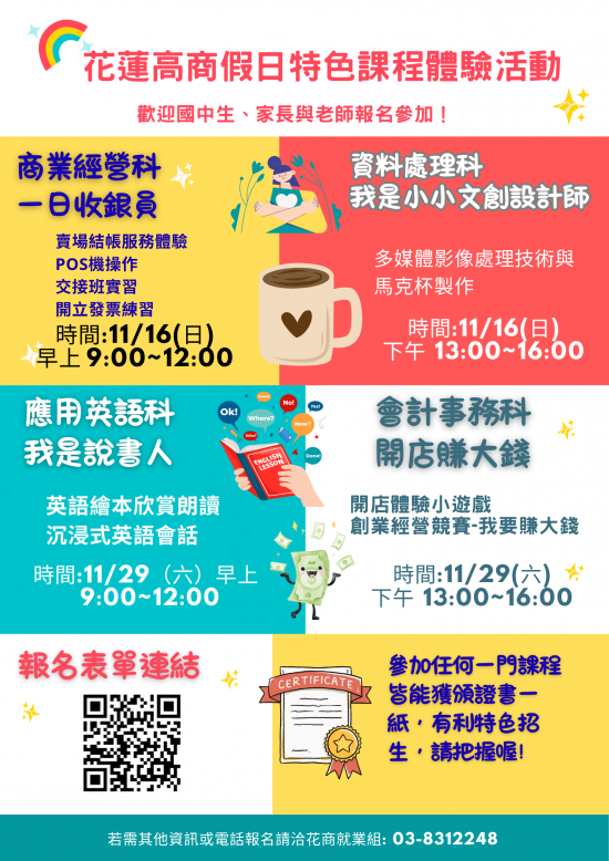 二、 活動時間:商經科114年11月16日上午9時至中午12時;資處科114年11月16日下午1時2時。應英科114年11月29日上午9時至中午12時;會計科114年11月29日下午1時至2時。詳細課程內容請見附件。