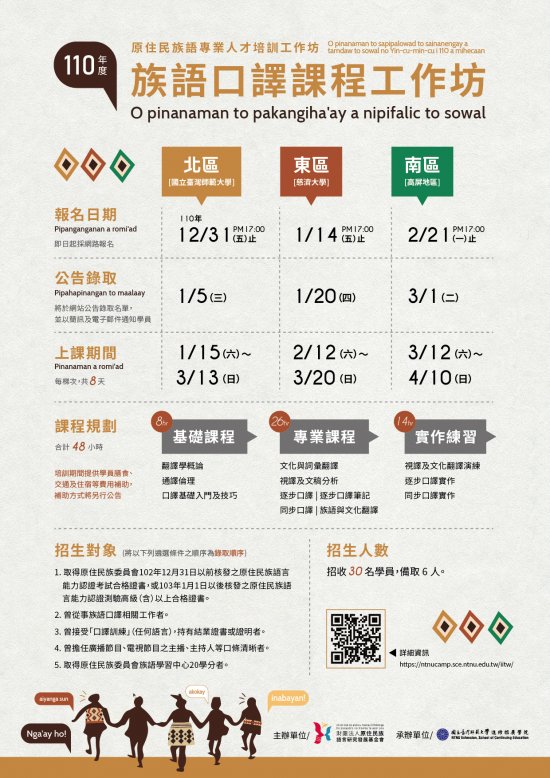 二、因應《國家語言發展法》及《原住民族語言發展法》的通過與實施,為厚植從事原住民族語工作人員熟悉口譯能力與技巧,成為族語口譯所需專業人才,除提升翻譯專業知能及人才培育,更希冀落實原住民族族語及文化之保存與研究。