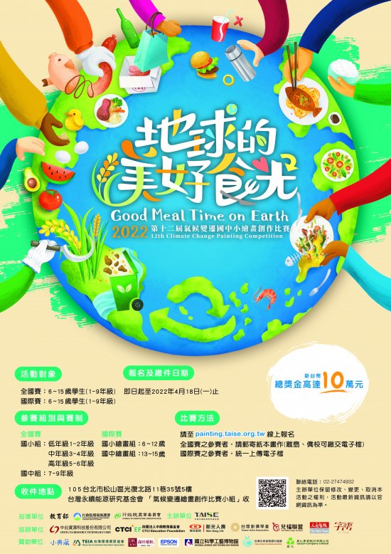 | 一、 | 由教育部、行政院環境保護署、行政院農業委員會指導,本會主辦之「氣候變遷國中小繪畫創作比賽」迄今已舉辦11屆,一共累計37國、52,666名學子參與。本屆為第12屆,為呼應聯合國永續發展目標(SDGs)的第2、12項,以「地球的美好『食』光」為主題,強化國中小學生、教師對糧食安全、永續農業、營養均衡與永續消費與生產等相關議題的認知,以及拓展國際觀並付諸實際的氣候行動。比賽也呼應聯合國永續發展目標第13項,鼓勵積極採取氣候行動,並提升大眾相關意識。 |