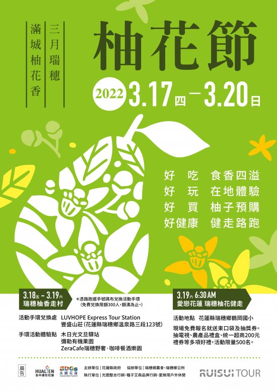 一、依據花蓮縣政府111年3月9日府農產字第1110048766號書函辦理。 二、瑞穗鄉坐擁花東縱谷壯闊景觀與豐富人文資源,鶴岡文旦更是全台遠近馳名。文旦柚於3月上旬開花,花期約20天,本次活動結合在地柚園,期讓所有參加者漫步在億萬朵的柚花海中,感受與享受瑞穗的天然美景。 三、旨揭活動於活動當日上午6時30分至8時整現場報名,報名參加者送束口袋、攤商消費券、抽獎券等紀念品,限量500份;當日即抽出55吋電視、文旦禮盒、紅茶禮盒、超商禮券、文旦沾醬及優質米等多項好禮共達303份。