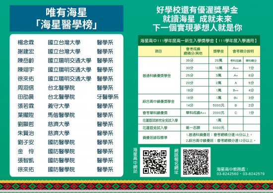 現有普通型高中(普通科)、綜合型高中(6專門學程),可供學術及職業傾向之國九學生選擇,連結網址如下:(一)2022海星高中簡介:https://www.youtube.com/watch?v=dxEsEY2M0Lo(二)開箱海星:https://www.youtube.com/watch?v=suMl4w8kUAA
