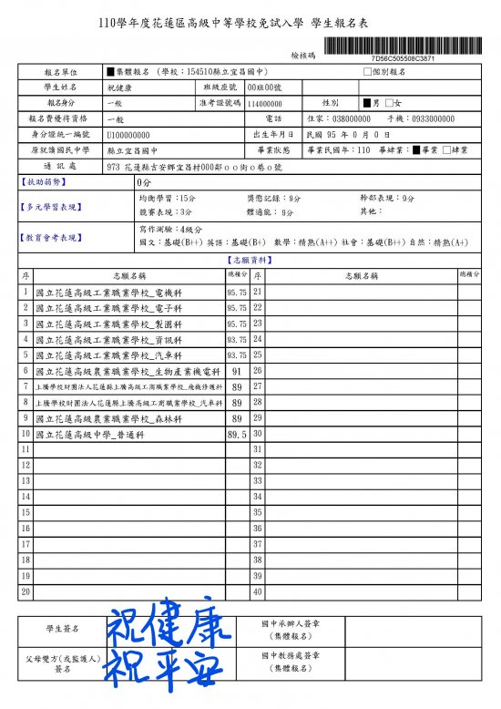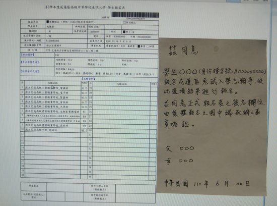 - 7月1日(星期五)高中職免試入學報名-志願選填確認單繳交紙本或電子檔。報名表件,請送交導師審核。志願選填確認單須全數繳回。(重要升學工作,請導師務必協助要求全班學生完成報名,放棄報名學生必須於7/1前繳交放棄報名切結書)
