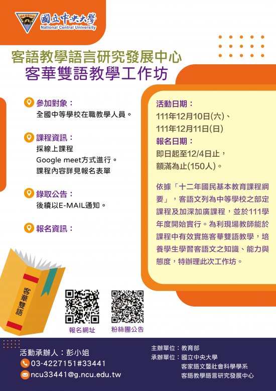 國立中央大學客語教學語言研究發展中心訂於111年12月10日至12月11日(星期六、日)線上辦理「客華雙語教學工作坊」,倘對本活動有相關疑問,請逕洽國立中央大學彭小姐,電話:03-4227151分機33441;電子信箱:ncu33441@g.ncu.edu.tw。