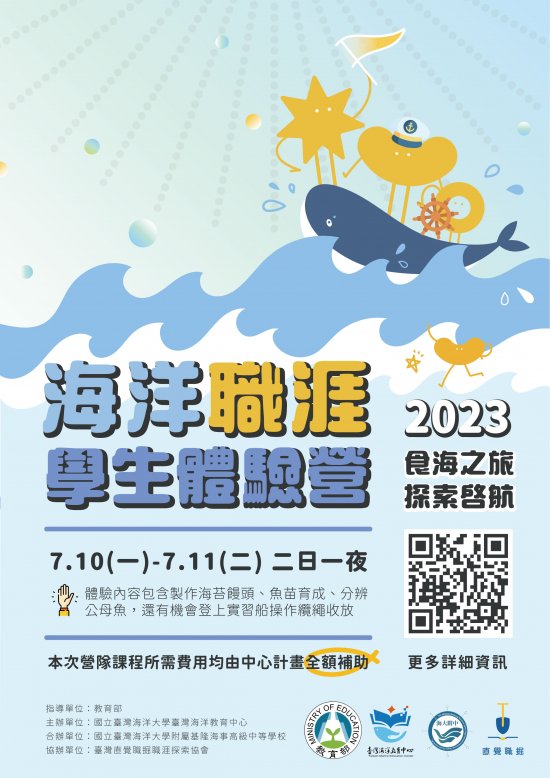 - 旨揭申請資訊如下:(一)報名日期:5月12日(星期五)起至5月31日(星期三)止。(二)營隊時間:7月10日(星期一)至7月11日(星期二)。(三)招生對象:國中在校生及應屆畢業生(不包含國小應屆畢業生) 共25人。(四)活動地點:國立臺灣海洋大學、國立臺灣海洋大學附屬基隆海事高級中等學校、育英二號。(五)報名資訊:https://forms.gle/2L9JS8dqBWTEveCd9。